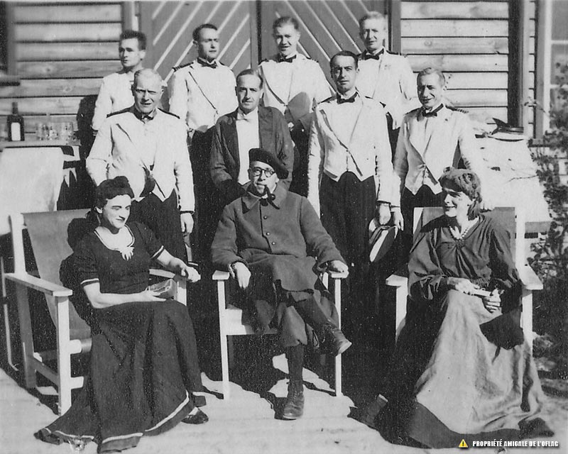 Oflag IID - Gross-Born : les acteurs du "Fleuve Etincelant" : L'Officier assis au centre avec la pipe et le beret est le metteur en scène de nombreuses pièces de théâtre, l'abbé André SOCHAL. 5 autres acteurs : Capitaines ? BEAUREPERE et FRAICHE (orthographes de ces deux noms non certains), X ?, Lieutenants Honoré LIONS et ? GAGNEREAU. Il manque 6 noms puisqu'il y a 10 acteurs sur cette photo et les 4 acteurs nommés ne sont pas identifiés. |
