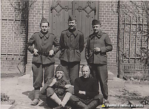 Oflag XXIB – Schubin : Au 1er rang, le 1er assis à gauche : Lieutenant Jean DEMAREZ. Au second rang au milieu : Lieutenant BOUHIN. Les noms des 3 autres prisonniers ne nous sont pas connus.
