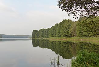 Nous reprenons la voiture pour rentrer, nous allons vers le Camp de pierre et nous nous arrêtons sur la route en contre bas de l'emplacement du premier Bloc IV. Le site de cet ancien bloc est envahi par une forêt touffue. Etienne l'a déjà visité après avoir découvert avec Dariusz des éléments sur une carte d'état-major au 1/25 000ème en comparant avec un plan dessiné dans le livre block IV. L'emplacement est visible sur le site NCAP (National Collection of Aerial Photography) sur les anciennes photos aériennes, sous l'onglet Rederitz (voir plus haut, Musée). Nous contournons à pied cet espace de forêt pour accéder à l'étang qui se trouve à proximité, le lac (Jezioro Busino). Il y a des roseaux, des arbres. Une beauté sauvage et calme. Etienne nous précise qu'il y a des castors. Un pécheur à la ligne, des pontons de bois par endroit attestent de l'activité ludique en bordure des rives.