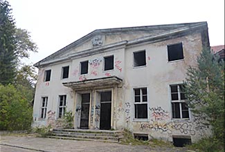 Plus loin, sous les arbres, près du panneau 11 mis en place par l'Office du tourisme, se trouvent les restes de la villa de Heinz Guderian, le général qui a théorisé la Blitzgrieg en associant les avions et les chars pour percer les lignes ennemies. D'après la photo d'époque figurant sur le panneau, c'était une superbe villa aux vastes dimensions, un genre de pavillon de chasse, l'étage à colombages de chêne. Du temps des Soviétiques, c'était une école maternelle pour enfants d'officiers, mais en 1990 le bâtiment a pris feu à cause d'un poste de télévision défectueux. Les belles maisons aux alentours étaient destinées aux officiers supérieurs travaillant au QG et à leur famille.