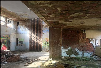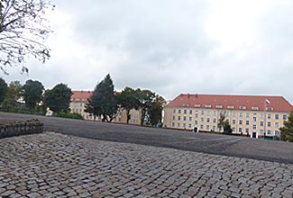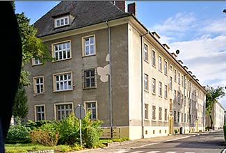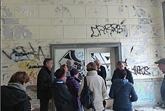 Nous ne pouvons hélas pas entrer dans le Bloc I, ni le prendre en photo, en raison de manœuvres militaires en cours. C'est une déception car c'était celui dans lequel était le père d'un certain nombre d'entre nous. On ne peut que le contempler de l'extérieur. Etienne nous montre où se trouvait la chambre 325 dans laquelle était son père ; toujours au troisième étage, un peu plus loin, la chambre 313 était celle de mon père. Juste en dessous, chambre 226 se trouvait le père de François Borel, et un étage plus bas, juste 2 étages en-dessous de la chambre du père d'Etienne, se trouvait celle du père de Laure et de Nicolas, dans la chambrée 125. Etienne nous explique que nos pères se sont forcément croisés dans l'escalier, les couloirs, ou se sont peut-être parlés au cours de leur captivité à Arnswalde. Nous ne pouvons pas non plus entrer dans la « Turnhalle » dont le périmètre est entouré de barbelés modernes, à cause des manœuvres en cours.