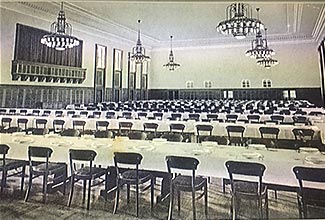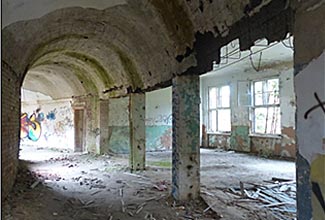 Dans la grande salle en rotonde, sur le mur du fond se trouvait une statue d'Adolphe Hitler. De part et d'autre de la rotonde, un couloir menait à la grande salle à manger dans laquelle quatre cents personnes pouvaient prendre place et neuf cents lors de concerts ou de films. Un balcon était réservé aux officiers supérieurs. Deux petites salles à manger sur les côtés complètent la structure en forme de fer à cheval. Sur le côté gauche du bâtiment, une rampe qui servait à ravitailler les cuisines, donne sur l'une des deux cours intérieures.