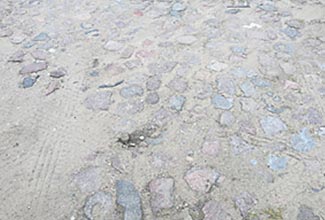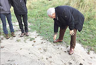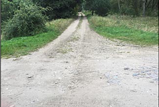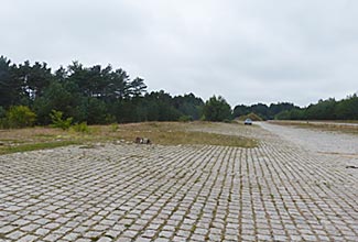 On visualise le remblai de la voie ferrée à voie unique qui déposait les prisonniers. Les rails ont été enlevés. On emprunte avec émotion le chemin aux pavés d'époque qui mène au camp, chemin suivi par les prisonniers français à leur descente du train. C'est la première fois que nous foulons la terre qu'ils ont eux-mêmes foulée, ici à Gross-Born, et plus tard à Arnswalde.