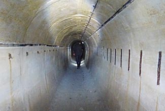 Munis de petites torches électriques, nous suivons Dariusz dans le sombre édifice après un passage sur une simple planche de bois pour traverser les décombres de l'entrée. Le tunnel est très bien conservé, très sain. De petites trappes au sol assuraient l'écoulement de l'eau en cas d'infiltration et permettait un système de ventilation. Sur le mur de gauche, des vestiges de l'installation électrique, sur celui de droite on voit les restes de boîtiers téléphoniques. Dans un petit couloir secondaire, Dariusz nous montre un trou de quatre mètres de profondeur : c'est un piège qui protège une porte. Par beau temps on peut sortir par une échelle et marcher dans la verdure, mais il pleut, aussi Dariusz décide-il que nous ferons le chemin inverse pour sortir en restant au sec. Ce bunker et ses ramifications ont été construits entre 1930 et 1944 par des ouvriers allemands, hommes et femmes (c'était l'époque de la crise), et par des prisonniers.