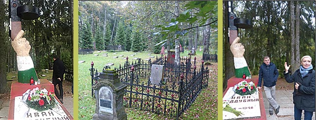 Nous allons ensuite au cimetière russe municipal de Borne Sulinowo. À l'entrée, un monument surprend. Il a été érigé à la mémoire d'Ivan Pogoubni, avec ses dates, 1926-1946. Sur un socle, fraîchement repeint de peinture brillante, se dresse à la verticale un tronçon de manche vert vif duquel dépasse une main droite rose, les doigts figés sur la gâchette d'un pistolet mitrailleur recouvert de peinture noireC'est ainsi que l'homme a été retrouvé mort, abattu par un Polonais et qu'il a été considéré comme un héros de la libération par les Soviétiques. Le monument avait été érigé au centre de Borne Sulinowo, et a été déplacé lorsque les Russes sont partis, et à ce jour, n'a jamais été profané.
