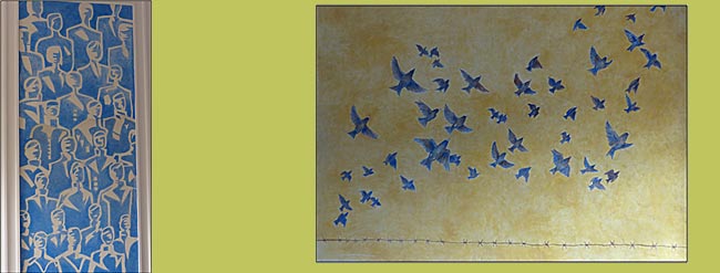 On arrive près du Musée de Borne Sulinowo où nous sommes hébergés. On admire les deux fresques de l'entrée, récemment conçues par Dominique Sabroux et des membres de son association « Les Passeurs de Fresques de Troyes (Aube). Celle de droite, dans des nuances de bleu, représentant une foule de soldats hiératiques pressés les uns contre les autres et celle de gauche portant un texte sur la liberté et illustrée par une envolée d'oiseaux dans le ciel.