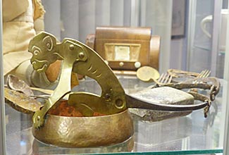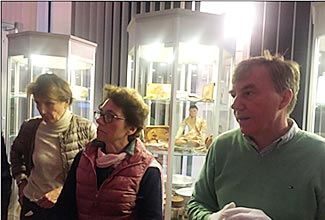La première vitrine Dariusz enfile des gants blancs et nous montre avec une grande délicatesse certains objets fabriqués par les prisonniers français. Une poupée, dont la tête est en papier mâché et les vêtements taillés dans une chemise d'uniforme d'été, a été achetée par le lieutenant DUTHIL avant l'un des deux Noëls passés à l'Oflag IID, pour l'envoyer à sa fille Colette qui l'avait surnommée « Oflagette ». Un singe en métal doré au-dessus d'une coupelle pour faire un cendrier. Une petite boîte à bijoux en forme de poste de radio, un brasero qu'on appelait « schubinette » (car inventée par un prisonnier venant du camp de Schubin – Oflag XXIB), objet indispensable à la survie des prisonniers car il permettait de faire la cuisine et de se réchauffer sans utiliser autre chose comme combustible que des boulettes de papier très serré. Une boîte en marqueterie représentant deux cigognes : la femme cigogne attend au nid le mâle qui revient vers elle. Assiettes ou gamelles originales. Souvent, c'était la famille qui envoyait le matériel ou les outils qu'on lui avait commandés. Des aquarelles, des carnets, un portrait d'André AUPETIT daté de 1943, signé par Jacques de GRANCHAMP et de nombreuses plaques métalliques d'immatriculation en aluminium de prisonniers polonais. A l'arrivée les prisonniers  passaient à l'enregistrement, se faisant établir une carte de police avec photo. La plaque comportait le numéro d'immatriculation de prisonnier et la référence de l'Oflag, immatriculation qui les a suivis lors des transferts de camp de l'Oflag IID à l'Oflag IIB. « L'ensemble est suspendu par une cordelette grise autour du cou comme nos anciens scapulaires. Il nous chatouillera la poitrine pendant cinq ans » écrit Raymond GANGLOFF, un officier prisonnier (témoignage sur le site de l'Amicale). On nous montre un très beau livre intitulé Block IV, textes et dessins réalisés par ses « habitants », scanné en totalité et visible sur le site de l'Amicale. Une plongée littéraire et artistique émouvante dans la vie et les états d'âme des prisonniers. Le carnet d'un officier polonais trouvé à 500 km à l'Ouest. Les polonais ont également effectué une longue marche vers l'ouest depuis l'Oflag IID de Gross-Born, commencée début Janvier 1945.