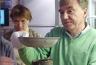 Dariusz et Etienne passent des gants de tissu blanc pour présenter les dons faits au Musée : - le sabre d'officier du père d'Alain Briottet, - un exemplaire du livre Jusqu'à Bergen, - des plaques d'identité, un tastevin donné par le groupe des Bourguignons, des photos, une médaille de la légion d'honneur et une croix de guerre, donnés par Madame VETOIS, fille du lieutenant Paul LACHAUD, - un livre de géographie portant le tampon de la censure. - Jean-Pierre vient présenter le drapeau nazi de l'Oflag IIB que son père avait arraché comme trophée en janvier 45 et qu'il a remis à son père à lui, officier polytechnicien, médaillé de la Grande Guerre, qui avait ramené des casques à pointe allemands après avoir détruit une place forte, lui prouvant ainsi qu'il avait, lui aussi, accompli un haut fait contre l'ennemi. Etienne montre ensuite le modèle réduit de la caravelle de Christophe Colomb, la Santa Maria, que son père avait construit durant la captivité à Gross-Born, en indiquant le chemin parcouru, depuis l'envoi par la poste à sa femme (après le transfert de camps) jusqu'au retour à Borne Sulinowo par transporteur routier, (Monsieur Podgurski passant par Valenciennes, chez la fille d'Etienne), qui méritait, depuis le temps, grandement une restauration effectuée par Monsieur Leszek Muzykiewicz. Etienne a sélectionné parmi les trois cent trente lettres et cartes de son père envoyées à sa mère, les seules phrases qui concernaient la construction de la caravelle, et en a fait faire une traduction en polonais par Tomasz, le petit-fils du docteur PAWŁOWSKI.