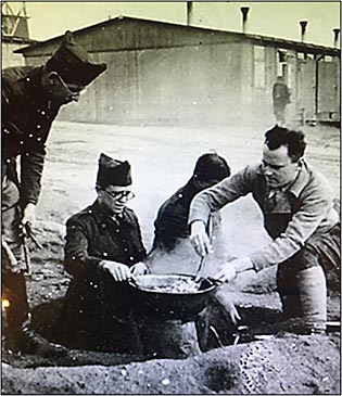 L'autre obsession dans les camps (en dehors de l'évasion) : la nourriture. La nourriture étant insuffisante dans les camps, les prisonniers survivaient grâce aux colis qu'ils recevaient de leur famille (jusqu'en juin 44). Pour partager ces denrées ils étaient organisés en « popotes » au sein desquelles on partageait équitablement le contenu des colis, car certains, dont les familles habitaient en zone occupée, étaient moins favorisés que d'autres. Il y avait un « chef de popote » chargé du partage. Adolphe TILLARD (père de Geneviève TILLARD décédée en mai 2017), était surnommé « pour qui ? ». Les prisonniers étaient pesés régulièrement. Etienne raconte que Schmitt, le cantinier du camp, (qui faisait du troc genre marché noir), a évité à nos pères de mourir de faim au début de la captivité. Il fut finalement découvert par les Allemands, car il détournait des biens appartenant à l'armée allemande ; il fut condamné à mort et, raconte Roger Ikor, « décapité paraît-il à la hache ».