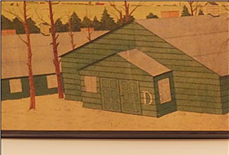Au mur de nombreuses reproductions de photos, beaucoup provenant de l'Amicale (par les soins d'Etienne), des lettres, des cartes postales (collections de Dariusz), des dessins. Photos au mur, par exemple celles de la dernière offensive nazie dans les Ardennes, appelée l'opération von Runstedt. Sur le mur des Français au-dessus de l'écran, un grand dessin du camp de Gross-Born réalisé par un prisonnier sur cinq feuilles de format vingt et un vingt-sept collées ensembles. Etienne nous montre que les différents blocks et baraques y sont représentés. Il nous apprend que des prisonniers sont restés six mois dans le premier Block IV (près du « camp de pierre ») (voir plus loin), puis ont été transférés dans le camp de Gross-Born, avec les autres prisonniers des blocs I – II – III, dans les bâtiments que l'on voit sur la droite de ce dessin, Block IV (bis, construit avant novembre 40). Les cinq baraques sont désignées par des lettres (A, B, C, D, E), tandis que les autres baraques ont des numéros. La chapelle de ce block se trouvait dans la « Baracke » B.
