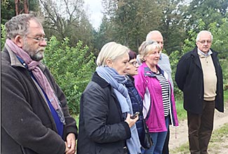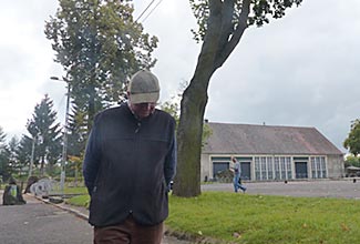 On parcourt à pied le chemin qui va jusqu'au lac où certains prisonniers ont pu bénéficier de rares sorties à l'été 41 (voir les photos d'époque). Plus loin, au milieu de la forêt, on voit les restes d'un système d'épuration des eaux, une profonde fosse en brique munie d'une échelle est visible, sans protection ni système de sécurité. Il y en avait d'autres, moins profondes, dans le camp. Sur la route du retour, nous nous arrêtons au bout d'une voie pavée, vers Deutsche Krone (Wałcz) : c'est le chemin qu'a parcouru Bertrand de Cuniac et son camarade lors de leur évasion en mars 42. Ils ont marché trente kms, puis ont pris le train jusqu'en Belgique, mais se sont fait reprendre, bien que munis de faux papiers de travailleurs français à Dantzig. Ils n'ont pas été crus par la police allemande. Treize sur les dix-sept évadés ont été repris et ramenés au camp, enfermés dans la même baraque au centre de l'Oflag IID. Un homme âgé apparaît dans le jardin de la dernière maison avant la forêt. Jean- Pierre et Etienne vont tenter de lui poser des questions, mais il n'a jamais entendu parler de cette anecdote. Il n'habitait pas la région à l'époque des faits.