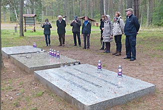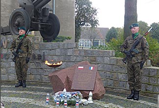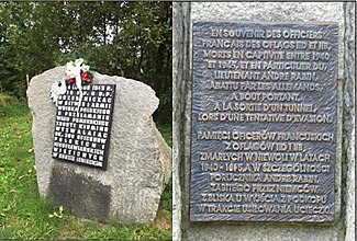En 1994, Bertrand de Cuniac avait reconnu les lieux, non balisés et enfouis sous la végétation luxuriante. A l'été 1999, Etienne découvre qu'un monument avait été érigé par l'AK (résistance polonaise obéissant au gouvernement de Pologne en exil à Londres), à la mémoire des prisonniers polonais, avec, au centre, une tête de Christ, mais sans mention des officiers français. En accord avec le général jean SIMON, alors président de l'Amicale, Etienne a envoyé un drapeau. En 2001, grâce à la participation du docteur Bolesław PAWLOWSKI, une cérémonie avec dépôt de gerbe a été organisée en présence de scouts et de militaires. A cette occasion les français ont apporté une plaque dont le texte a été écrit par le général jean SIMON et traduit en polonais. En 2003, le monument dédié aux Français fut inauguré par Etienne avec un texte du général Jean SIMON. C'est l'école de Borne Sulinowo qui est chargée d'entretenir ces lieux. Etienne prononce quelques mots à la mémoire d'André Rabin (1918-1942), sa famille étant restée sans descendance, il indique que l'Amicale est en quelque sorte sa seule famille. Laure et François déposent une gerbe, une minute de silence est observée, les photophores sont disposés en « Croix de Lorraine » à la demande d'Etienne. Nicolas et Marguerite déposent des bougies devant le monument à la mémoire des prisonniers polonais. On observe une autre minute de silence, les Polonais chantent « la Marche de Dobrowski » (« Mazurek Dąbrowsckiego »), puis, nous, le premier couplet de « La Marseillaise ».