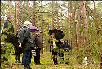 Départ pour Woldenberg, l'Oflag IIC de Woldenberg (actuellement Dobiegniew, à environ 50 km au sud d'Arnswalde, où étaient détenus environ six mille prisonniers polonais : en majorité des officiers, dont le grand-père de Woyzeck qui nous accompagne, mais aussi des « hommes de rang » (non gradés). Il pleuviote. La route est magnifique : des forêts de pin sylvestre aux troncs longs et fins, rouges et serrés bordent la route, ainsi que des bois de bouleaux plus aérés aux troncs noir et blanc. Ces paysages me rappellent ceux des films du cinéaste polonais Wajdja (Laure).