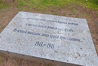 Dans la forêt, on arrive au cimetière russe du camp, gigantesque, très impressionnant. Les arbres de la forêt forment des voutes naturelles pour veiller à toutes ces croix de bouleau semblables rangées en ordre serré à perte de vue. Etienne précise que le bouleau se putréfie vite, ce qui explique que certaines croix soient en mauvais état (certaines croix ont même été remplacées par d'autres en plastique, ce qui est bien dommage, et qui se détériorent aussi). A l'entrée, une imposante stèle centrale et trois plaques de marbre au sol sur lesquelles figurent le même texte, en russe et en polonais.