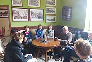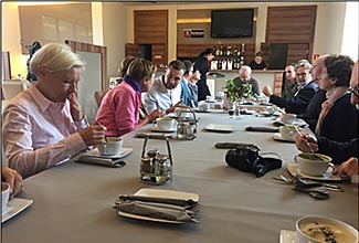 Avant le dîner, « Debriefing » qui commence par des remerciements à Etienne. Laure et Nicole ont concocté un dessin et un rébus plein d'humour sur un papier, chacun y a ajouté quelques phrases en souvenir. Elisabeth et Jean-Pierre offrent, en clin d'œil, un petit livre pour enfants trouvé à la Poste, avec le nom d'animaux sauvages que nous avons vus grâce à lui. On a tous apprécié le parcours qui a permis de fournir un cadre officiel à une histoire personnelle (François). On a admiré le Musée, son agencement, ses témoignages (Olivier), la délicatesse et le professionnalisme de Dariusz. Elisabeth souligne l'importance des souffrances partagées dans ce pays. Jean-Pierre conclut qu'à présent, c'est à nous de transmettre ce douloureux passage de la vie de nos pères.