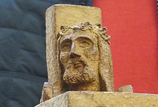 La sculpture du Christ est en temps normal placée sur un socle au-dessus de la porte : en sortant on peut la voir en s'inclinant.