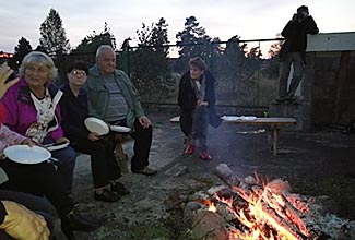 Le soir nous sommes accueillis par Dariusz, un peu contrarié par notre retard. Toute l'équipe nous attendait. Un barbecue avait été préparé dans un espace jardin de l'autre côté du lycée collège. Nous nous asseyons en cercle autour du feu et, munis de longues piques, tentons vaillamment de faire griller nos saucisses. Salades, dessert et vin à volonté.