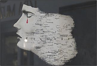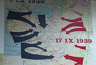 Une autre carte situe l'emplacement des camps. Les camps d'extermination ont été installés par les nazis sur le territoire polonais pendant la guerre (appelé alors « gouvernement général »). A Katyn près de Smolensk, furent assassinés plusieurs milliers d'officiers polonais sur ordre de Staline. Au printemps 40, la police politique de l'URSS a perpétré des assassinats dans l'armée polonaise (officiers d'active et de réserve), jetés dans des fosses communes. En tout vingt-sept mille officiers polonais assassinés, soixante mille déportés. L'objectif était d'anéantir toute l'intelligentsia polonaise. Les charniers ont été découverts en 1941 par les nazis : « Regardez ce que les Russes ont fait ! » ont-ils dit. Mais l'URSS a longtemps rejeté la responsabilité de ce massacre sur les nazis*.