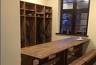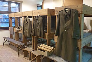 Reconstitution d'une chambrée : des châlits de trois lits superposés, collés les uns aux autres, une table et quelques tabourets, ce qui représente 1m2 par personne. En hiver, la température intérieureétait de 4-6 degrés, avoisinait parfois les 0 degrés, avec des champignons d'humidité aux murs, des ampoules très faibles de 15/20 watts.