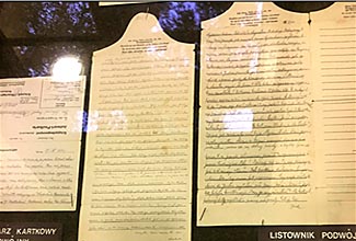 La deuxième vitrine Premier cimetière de neuf cent cinquante Russes près du bloc IV. Cimetière où ont été effectuées des exhumations en 2002-2004 sous la direction du professeur Kolar, de l'université de Poznan ; il y a aussi quelques tombes françaises. Les soldats de l'armée rouge avaient leur identité militaire inscrite sur un morceau de papier roulé dans un petit tube. Certaines de leurs « fiches de prisonniers » ne comportaient pas de photo comme sur celle des Français, mais l'empreinte de leur pouce droit ; ils étaient tellement nombreux... Leurs conditions d'enfermement étaient très dures, ils étaient très mal traités avec des cas de cannibalisme entre prisonniers. Pour les tenants du Reich, les Slaves avaient un statut très inférieur ; la pyramide des races établie par les nazis : tout en haut, « les aryens », tout en bas « les slaves » et encore plus bas « les juifs ». Par ailleurs, Staline n'avait pas signé la convention de Genève garantissant une protection aux prisonniers de guerre. Un principe pour les nazis : les affamer. Vingt mille Russes sont passés par le stalag 302, voisin de l'Oflag IID. Il y a eu environ dix mille morts dans les deux cimetières à côté de cet Oflag.