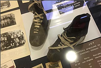 Dans une vitrine : des lettres de format spécial « camp » : un volet pour écrire, un volet pour la réponse (les prisonniers avaient droit à deux lettres + deux cartes par mois), des dessins, des timbres-poste valables au camp superbement dessinés, un carton d'invitation (« en cas de chaleur, habit : chemise américaine », c'est-à-dire chemisette), des compositions musicales. Une vitrine est dédiée aux activités sportives et culturelles, photos du Club Planeurs (mon père était fan d'aviation, dit Laure) et on peut y admirer une splendide paire de chaussures de foot de l'époque.