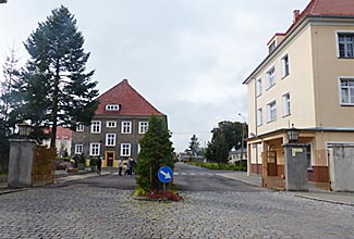 Plus tard nous longeons de grands bâtiments massifs en ruine : dans ces bâtiments étaient stockés du blé et d'autres céréales et produits agricoles du temps des Allemands, puis des Soviétiques. L'un des bâtiments était une boulangerie industrielle (utilisée pour fabriquer le pain pour le polygone d'entrainement. Le toit en éternit est d'époque. Une bannière est accrochée au-dessus de l'entrée « Wystawa » (Exposition). Le terrain en face, labouré de traces de chenilles sert, en août, au rassemblement des « accros » des vieux matériels militaires. On peut trouver des « chars à louer » pour des manœuvres ludiques. Cela fait partie des attractions estivales proposées par la ville qui attirent un nombre important de visiteurs.