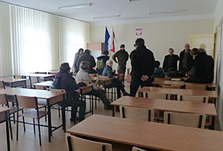 On entre dans une salle durant un cours d'anglais destiné à des élèves de première année de lycée. Nous sommes reçus par le professeur d'anglais. Etienne fait un petit discours pour leur expliquer, comme il le fait souvent, qui nous sommes et pourquoi nous sommes là. « Nous sommes sans doute des dinosaures pour vous…». Marguerite, la femme polonaise de Nicolas, traduit le discours d'Etienne, (qui ne parle pas polonais !), pour les huit élèves présents qui écoutent poliment. Au-dessus du tableau on remarque une croix chrétienne et l'emblème national, l'aigle couronné. Sur le mur de droite, un tableau avec des maximes anglaises, des listes de verbes anglais à particule. Laure prend des photos mais malheureusement à contre-jour. On ne voit pas grand-chose.