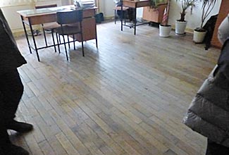 Visite du Bloc II. Nous entrons dans le Bloc II. Le Lieutenant Maciag nous fait la visite, manifestement il s'intéresse de près à l'histoire de sa caserne. Les chambrées sont maintenant des bureaux ou des salles de cours. Les murs (environ quarante-cinq centimètres d'épaisseur) forment un arrondi gracieux à l'encadrement de la porte. Il montre, dans certaines salles, tout ce qui est d'époque : le parquet de bois, les plinthes percées de trous (à présent bouchés) pour l'aération (il y en a environ dix par pièce), la rampe de bois, la volée de sept marches à l'entrée, l'escalier à chaque extrémité du bâtiment.