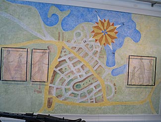 Le directeur nous explique que le musée a trouvé refuge dans d’anciens bâtiments militaires allemands bien rénovés. Il en est de même du lycée voisin qui a choisi un nom en hommage à l’oflag IID et à ses anciens prisonniers français puis polonais (« Bohaterów Oflagu IID » = « Les héros de l’Oflag IID » – ndlr). A l’entrée du musée, le directeur attire notre attention sur les deux fresques à la chaux, de part et d’autre de l’entrée, œuvres de Dominique SABROUX et de son  équipe de l’association « Les Passeurs de Fresques » de Troyes (Aube). L’une représente une colonne de prisonniers en rangs serrés, l’autre l’envol d’oiseaux au-dessus d’un fil barbelé ; une troisième fresque, dans la première salle, représente, sauf erreur, le plan de la ville de « BORNE SULINOWO » à partir de 1993, ex « GROSS-BORN LINDE » avec des habitants venant de l’est et de l’ouest (en fait de partout) pour repeupler cette ville désertée par les troupes soviétiques ; cette fresque (‘ photo ci-dessous) vient d’être réalisée au début  juin par la même association présidée par Dominique SABROUX. Le thème a été créé par Madame Danièle TOURNEMINE, artiste française présente lors de la réalisation de cette grande fresque (son site internet : http://danieletournemine.fr/ - ndlr).