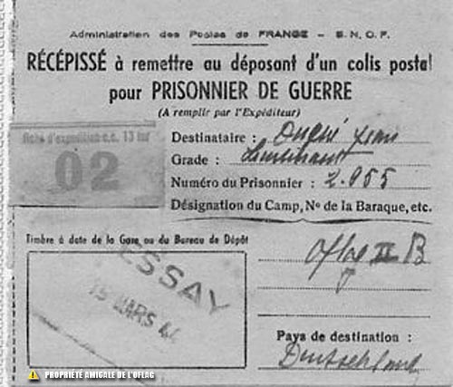 Récépissé d'un dépôt de colis à la poste, en france, et destiné à un prisonnier de l'oflag IIB, le Lieutenant Jean DUGUE.