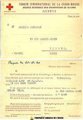 Carte de la croix rouge prévenant la famille du Brigadier Léon MAINERAY de son lieu de captivité : l'Oflag IID de Gross-Born.